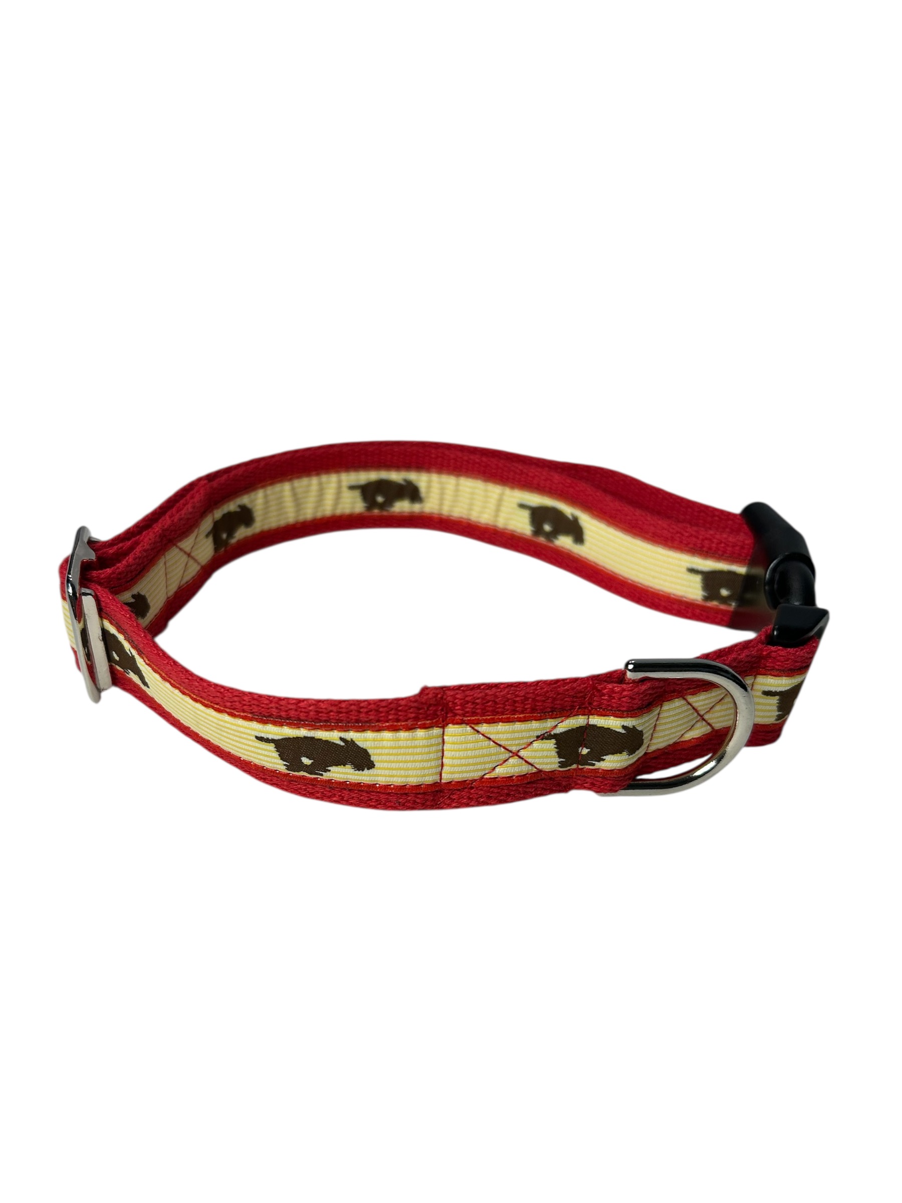 running dogs ribbon collarDescriptionSturdy red cotton webbed collar is overlaid with a beribboned loop of running dogs in hot pursuit. Snaps closed with a durable plastic fastener. Companion lead repeats the pattern. To choose the correct collar size, click here. |