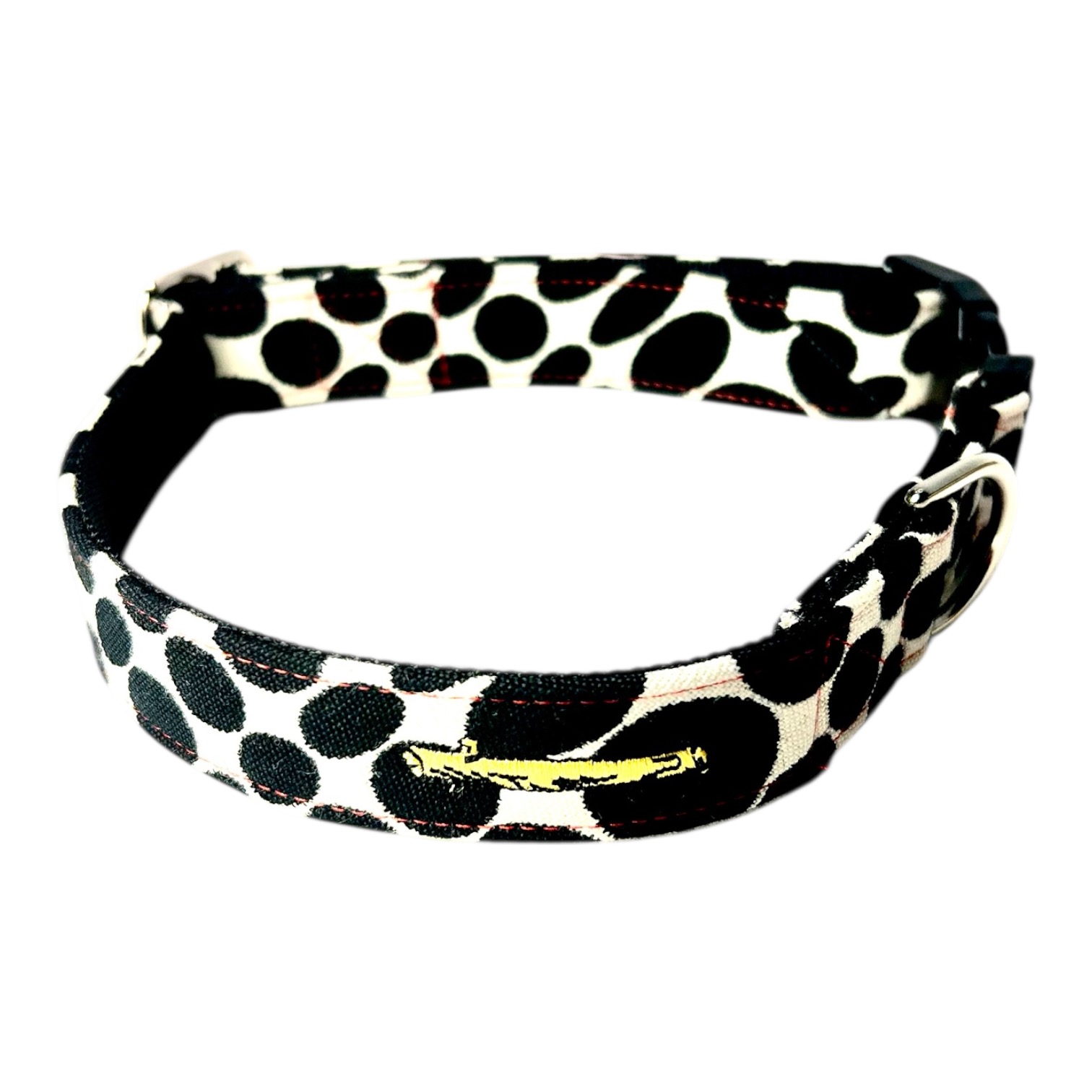 Fabric designed by Verner Panton in 1965, rife with groovy mod cred. Backed with black nylon webbing, this sturdy collar snaps closed with a durable plastic fastener. Embroidered George “stick” logo in yellow.