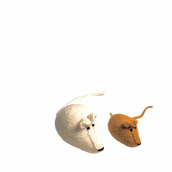 shake, rattle, and roll. hand-knit in peru, these alpaca mice are soft, expressive, and satisfy those intense mousing urges. a rattle is sewn inside for aural stimulation. available in light brown, and creme.
