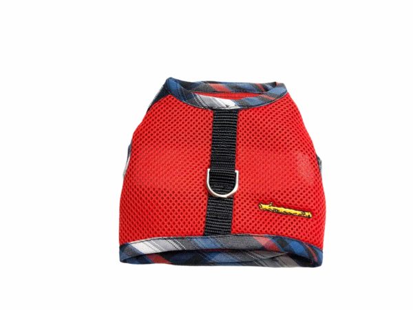 breathable poly perforated mesh fabric in cherry with black nylon webbing detail along the back. dee ring sewn into nylon webbing allows easy attachment of lead to vest.