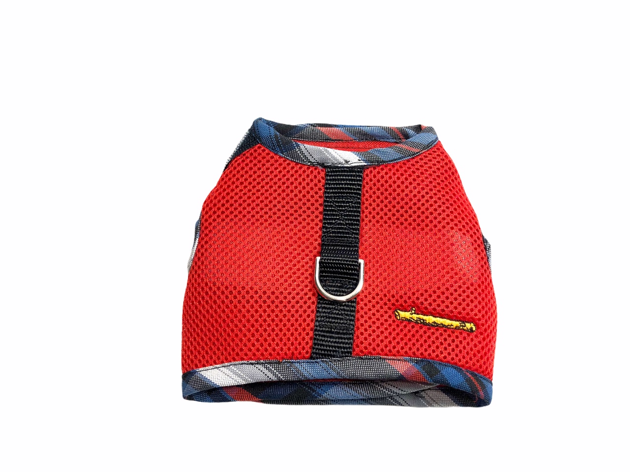contrasting plaid binding, with easy to fasten, heavy duty velcro closure at neck + belly.